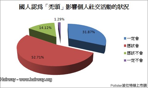 最后一个问题为“您认为“秃头”会影响个人的社交活动或是交友情形吗?”,结果显示有31.87%表示“一定 会”,“应该会”则有52.71%,“应该不会”则占了14.12%,“一定不会”仅有1.29%。许多男性到了中年之后都会开始为自己的顶上烦恼,因为 “雄性秃”顾名思义都事发生在男性身上,每位男性一旦出现大量掉发的状况,每天都想尽各种办法希望能够拯救秃发问题,甚至不惜花大钱订做假发或者植发。从 这些状况可以清楚发现,“秃头”的确让很多人在意跟困扰。