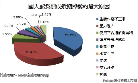 那么到底造成落发的原因为何呢?有39.39%表示“生活作息不正常”是主要原因,其次是“压力过大”占了 36.41%,其他如“使用不合适的洗发精”、“头皮未清洗干净”等等原因,都仅占个位数的比例。这样的结果可以得知,现代人落发的主要原因都是“生活作 息不正常”以及“压力过大”所导致,这也是经过医学上证明容易掉发的主要原因,会造成落发的原因有许多,若要解决这方面的困扰需要从各个层面进行改善。
