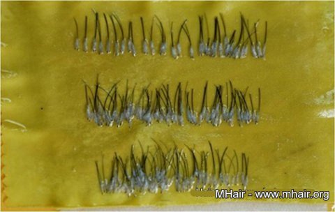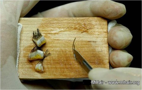NHT式原理是在肉眼下将1cm宽的块状头皮先切成0.2cm宽的长条状头皮,然后再分离成各种不同的发株单位,在肉眼下很仔细地分离发株,而NHT式则在手法熟练的多位技术员仔细操作下能完整地将毛囊分离出,而且可切割成全部单毛囊发株或双毛囊发株。