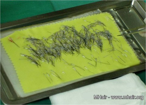 一般 使用头枕部〈后脑勺〉为捐赠区。捐赠处的毛发不含雄性素的接受器,移植到落发的地方后仍能生长良好。将捐赠区的毛囊一株一株取下,不必切开头皮。再以法式 植发机,利用真空吸力将发株吸入细小管子内后,再利用强大的气压将发株压入打好的植入孔内,需多位技术员配合植入。植入的过程中,需注意因压力太大而导致 毛囊受损的情况,以及发流的控制都是植发好坏的关键。