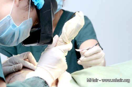 手术方式是用直径0.6~1.0mm 的钻孔器(Biopsy Punch) ,一样在后枕部的头皮上,以钻取的方式撷取一株株的毛囊并将其拉出,一个小时约可撷取100多株左右,再将这些毛囊移植到需要植发的部位。植发过程中的毛囊损伤率约5%与传统FUT的毛囊损伤率相当,FUE的优点是括取毛囊处的疤痕不明显、疼痛感低、伤口愈合快(约一星期)、身体其他部位的毛发都可用来移植;缺点是耗时长、费用高、不适合需大量植发者。