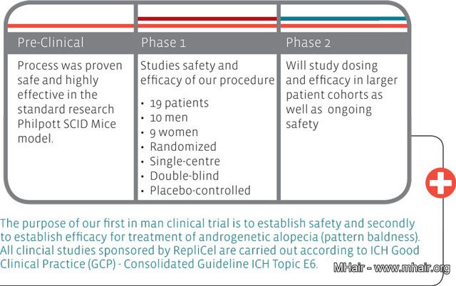 RepliCel在2010年12月开始进行临床试验,以研究此疗法治疗雄激素性脱发的安全性和有效性。第一阶段的I / IIA临床试验,以评估人类的自体毛囊细胞,用来治疗男性与女性雄激素性脱发的安全性和有效性,采随机、单中心研究、双盲、安慰剂控制。(randomized、single-centre、double-blind、placebo-controlled)。试验受试者在 Georgia接受头发毛囊切片。检体被送到在奥地利的cGMP实验室,进行细胞复制。