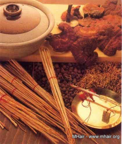 侧柏叶若干。将柏叶阴干研细,以春油浸之。每戟蘸刷头,头发长出后,用猪胆汁人汤洗头。