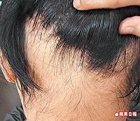 接获病例的皮肤科开业医赵昭明说,女子本来发量就多,烫发后更蓬,因此想拉直,买了直发膏依说明书使用,涂第一剂时 并无异状,涂第二剂时头皮发痒,虽冲净仍有轻微痒感,原不以为意,未料约经一周,后脑勺一路往上掉发,随手一抓都是大把落发,两个月来到处就医仍治不好, 后脑勺已快秃光,只能戴帽遮丑。