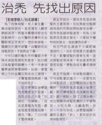 蔡呈芳指出,雄性秃是造成掉发的主要原因,但如果能在发际线倒退的初期就开始接受治疗,能有效延缓掉发速度。有些人掉发原因是头皮发炎,只要给予药物控制发炎,就能获得改善。