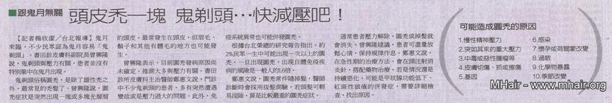 鬼月来临,不少民众认为鬼月容易“鬼剃头”。书田诊皮肤科副院长曾兴隆说,鬼剃头与压力有关,患者并没有特别集中在鬼月出现。