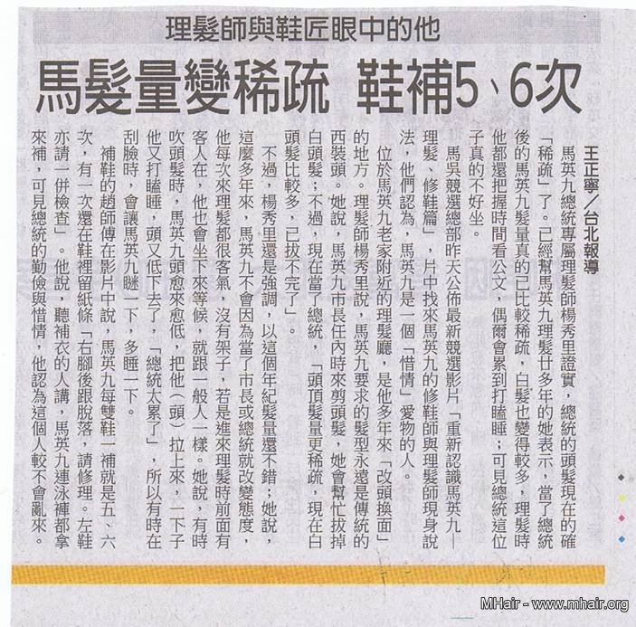 马英九总统专属理发师杨秀里证实,总统的头发现在的确“稀疏”了。已经帮马英九理发廿多年的她表示,当了总统后的马英九发量真的已比较稀疏,白发也变得较多,理发时他都还把握时间看公文,偶尔会累到打瞌睡;可见总统这位子真的不好坐。
