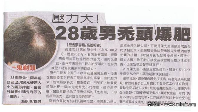 陈先生是家中独子,原本在金融业服务,后来在双亲要求下辞去工作接掌家中事业。由于压力大,他常暴饮暴食,体重破百;两年前,他发现头顶出现一个5 0元硬币大小的掉发,但不痛不痒,医师诊断他除了罹患俗称的“鬼剃头”,即所谓的圆秃,也有雄性秃的问题。
