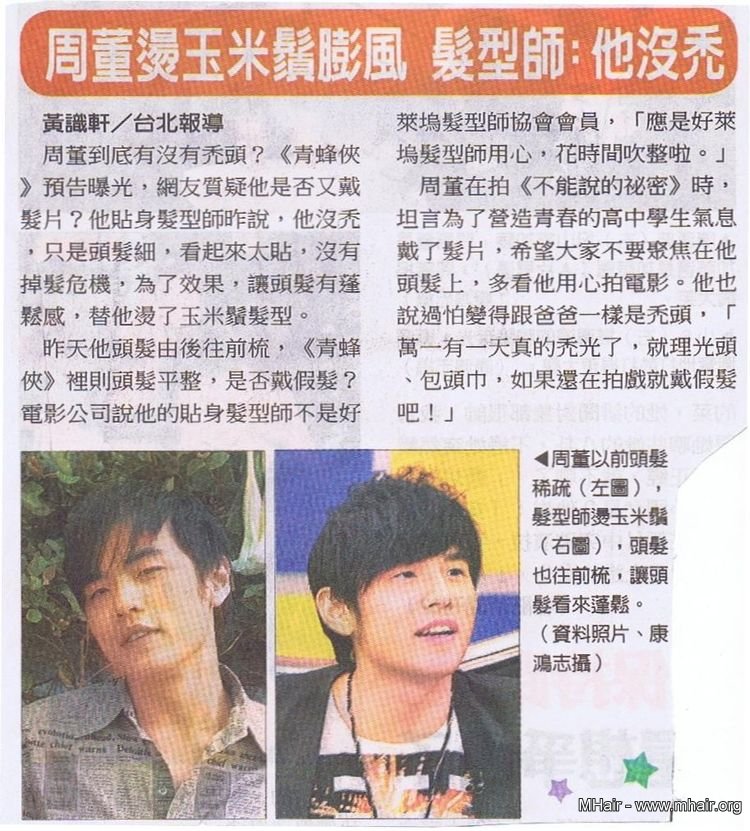 周董在拍《不能说的秘密》时,坦言为了营造青春的高中学生气息戴了发片,希望大家不要聚焦在他头发上,多看他用心拍电影。他也说过怕变得跟爸爸一样是秃头,“万一有一天真的秃光了,就理光头、包头巾,如果还在拍戏就戴假发吧!”