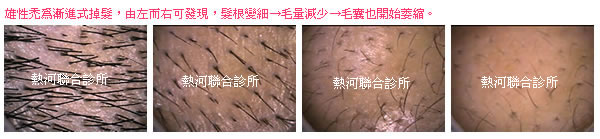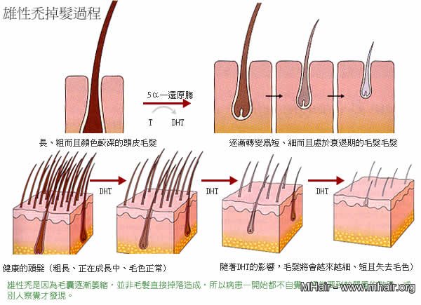 重新检视雄性秃的本质—Androgenetic Alopecia,其中两大基本要素Androgen雄性素,男性荷尔蒙与Genetic遗传,意味着此一型秃发与荷尔蒙及遗传体质有着莫大关系;男女皆有男性荷尔蒙,只是量的高低有所不同而已。而雄性秃患者的毛囊对男性荷尔蒙特别敏感,容易进入休止期,头发容易脱落或只剩下细小的毫毛,在男女性皆可能产生,只是女性集中在头顶,头发密度变稀薄,不像男性会有发线日渐后移、头顶露出光秃的头皮现象,随着年纪增长,落发程度会增加,直到顶上无毛。