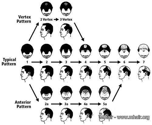发线稍微往后退,形成2个三角形,称为第1、2型。当2个三角形的顶尖持续退到耳朵上方,即为第3型。可是,第3型有另一种亚型,即患者头顶漩涡处开始变
