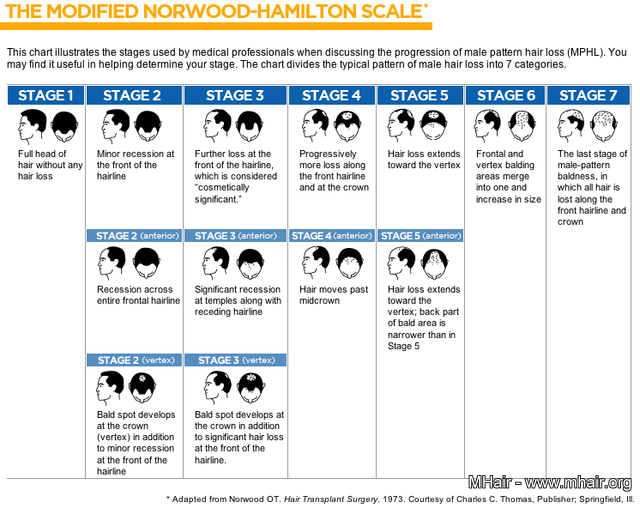 们所熟知的雄性秃。有西方学者观察典型男性与女性的掉发进程,绘制了雄性秃的分期图,让我们大概能够预测在当自己有雄性秃掉发时,头顶的哪些头发会狠下心