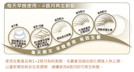 至于有些人在使用初期会有掉发增加现象,这是因为头发的生长周期分为成长期、退化期、休止期,Minoxidil成分会帮助处于退化期的不健康的毛发加速掉落,以利进入新的生长周期,属于头发汰旧换新的自然历程,通常此现象最多只会持续一个月左右,无须过度担心。