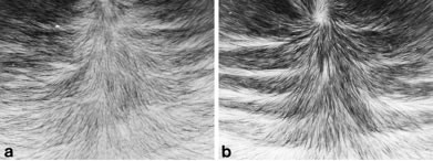 5%的浓度:a为实验前,b为实验后:四个月后,毛发密度、长度皆有所增加。