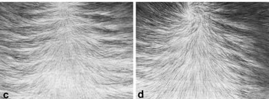0.5%的浓度:c为实验前,d为实验后:四个月后,可见到毛发密度稍微增加。