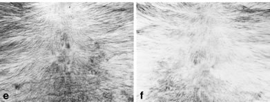 安慰剂治疗:e为实验前,f为实验后:四个月后,没有毛发再生的情况。