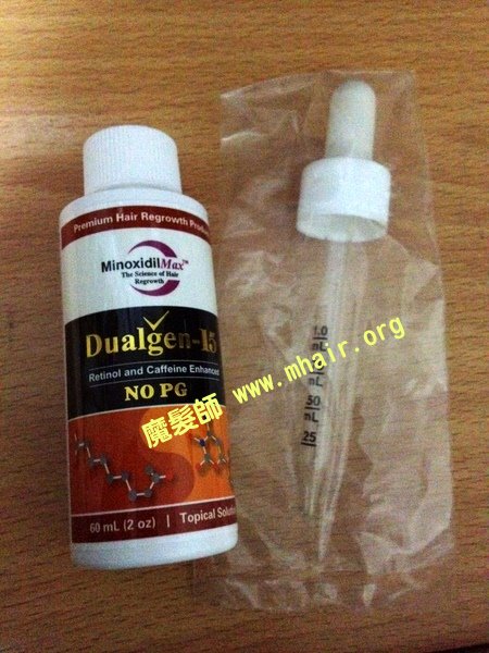 但它的缺点也是不能不说的,使用后,会令头发有一点点油油的感觉,然后由使用直到它干透后,需要一些时间,然后 也含有丙二醇的,这一点也是令我有所顾虑的,但因为它的生发情况也是非常不错,所以就一直坚持使用到现在,但直到前一段时间,收到卖家的消息说它已经停产 了,然后我也马上问家卖我现应该如何做是也?然后卖家亦告知我,第一个方案是先转用的同牌子10%生发水,第二个方案是先转用5%的生发水,然后待有新的 15%生发水再转回,所以这一段时间,也是令我非常的头痛,然后自己也是再到网上希望能寻找一些能替代的15%生发水,但也未能找到一些配方大致相同的, 然后在考虑是否要转回同牌子的10%生发水时,卖家传来一封e-mail说已找到新的替代15%生发水,这支新的15%生发水叫15% Minoxidil Dualgen,我也开始对这一支15% Minoxidil Dualgen做了一些货料收集,它是由Minoxidil Max生产的,详细了解了这一支新的生发水后,马上决定转用。