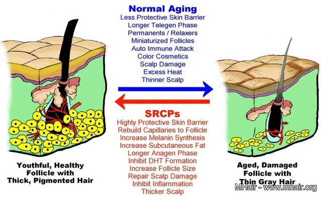 当我们年轻的时候,我们的头皮是丰厚的,与毛囊数量是比较多的。我们的毛囊也有充足的血液以提供必要的营养,随着老化,毛囊的数量越来越少。 对男生来说,DHT会侵袭毛囊,导致毛囊萎缩,阻碍头发的生长。所以毛囊会越来越少,发量也会越来越薄。修护皮肤的铜胜肽可以增加头皮的健康、活化毛囊。