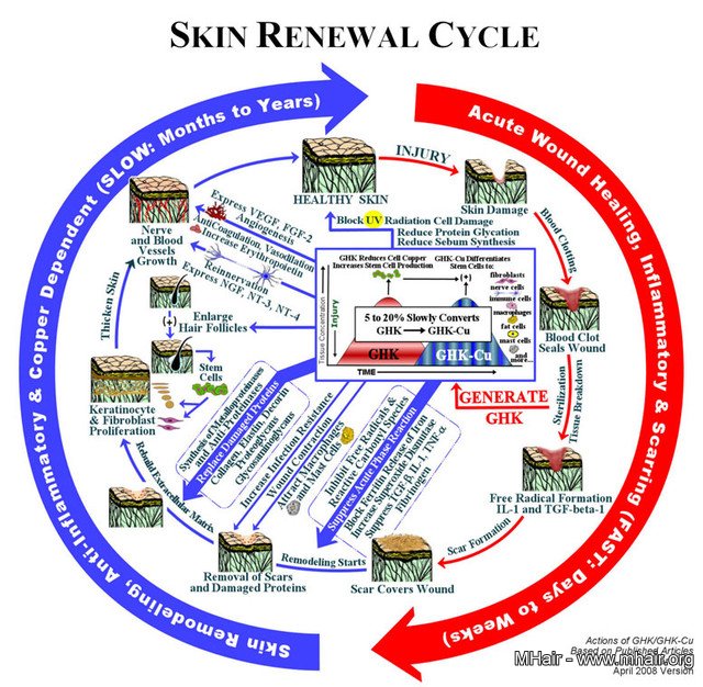 透过动物实验,Loren Pickart PhD发现人体血浆中的GHK-Cu铜胜肽,可试图反转某些动物的衰老过程。自此之后,各种铜链结胺基酸copper-peptides也被发现可以加快再生修复多种哺乳动物的细胞组织: