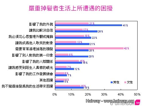 tns 进一步询问已经面临严重掉发问题的受访者,试图了解掉发是否为他们的生活带来任何不便?结果发现,男女看法不同。男性认为最主要的困扰是“影响外貌” (41%),其次是“让自己没自信”(26%)。大多数女性困扰于“清理掉落的头发”(42%),其次才是“影响外貌”(21%)的问题。由此可见,掉发 不但影响患者的外貌,甚至可能造成心理伤害。不过,可能女性掉发的症状多为发量平均变少,不像大多数男性呈现的秃头,因此女性对于外表危机的感受程度相对 较低。