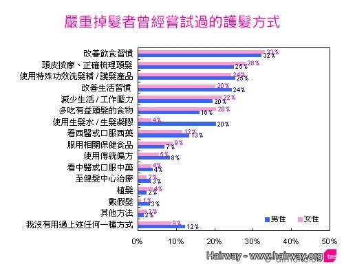 至 于大家耳熟能详的生发水或是凝胶,男性使用过的比例明显高于女性。有严重掉发的男性受访者之中,曾使用生发水/凝胶的比例高达两成,而有相同问题的女性受 访者中,却只有4%曾使用这类产品。虽然本次调查并未深入探究造成差异的原因,但是tns研究经理郑佩玲认为,这可能和生发水长久以来让消费者认为是“治 疗男性秃头”的刻板印象有关,因此即使是严重掉发的女性,也不会想要使用生发水/凝胶,也不知道市面上有女性专用的产品。