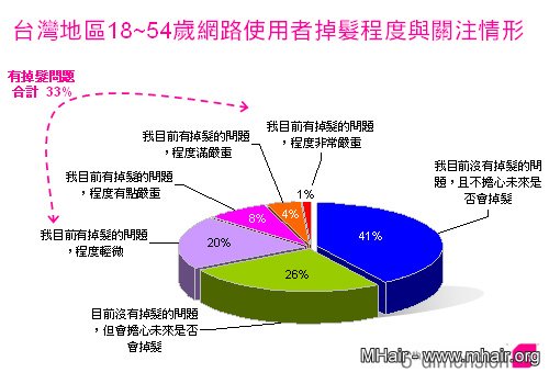 tns 模范市场研究公司透过EmailCash进行的一项网路调查发现,每三位18~54岁的台湾成年民众中,就有一位坦承自己有掉发的问题(33%)。另人惊 讶的是,26%的受访者虽然目前没有明显的掉发问题,却已经担心自己将面临“电火球危机”,害怕今日的掉发成为明日的遗憾。可见“掉发”在媒体、厂商、医 师的不断关注、报导之下,已经成了大多数网友关切的问题。