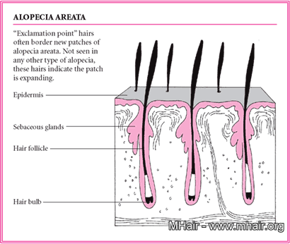 局部 免疫疗法,可说是最后的手段,透过涂抹一些过敏物质,最初是使用DNCB〈dinitrochlorbenzene〉,但因有致癌的危险,目前已改用像是 squaric acid dibutyl ester、Primulu obconica、diphenylcyclopropenone等物质,头一次涂抹后两周开始由低浓度逐渐往上,每周涂抹至局部出现轻度过敏性湿疹反 应,之后持续治疗到完全再生,约要6到12个月见效,大约有百分之四十的患者可耐受治疗,而在接受六个月的连续治疗后会长出至少50%头发,之后再逐渐减 少涂抹频率,每月一次持续半年到一年。免疫疗法的生发效果,最符合现在的实证医学,然而对于全头秃患者,往往长出来的部分并不完全,一旦停止,1/3患者 辛苦长出的头发可能又会掉落。此种治疗除去需每周就诊的不便外,局部湿疹、痒感、形成水疱都颇为常见,至少50%出现,甚至有4成会出现自体激敏化,也就 是在未治疗处也产生湿疹或过敏现象。另外也会有淋巴结肿大及局部色素沉着或白斑现象。但上述的局部治疗即使有效,也只能有局部效果,无法防止其他部位的持 续掉发,要全面性防止掉发一般是用高剂量口服(6周、每周一次 40mg、每周两次5mg betamethasone或每月一次)或住院点滴注射类固醇,约需要半年疗程,但年纪较大、有高血压、心脏病、糖尿病或肝功能异常、B型或C型肝炎带原 者不建议此种方式治疗。高剂量点滴注射类固醇其它常见副作用还包括感染、高血糖、高血压、肠胃症状(消化不良、恶心、腹泻)、精神症状(躁动、失眠、兴 奋)、脸潮红、关节积水、红疹、心悸、头痛、出汗、味觉异常、肌肉骨骼酸痛、月经失调等,但一般停药后一两天即可消失,但长期反覆治疗也会引起白内障及满 月脸等副作用。理论上口服的环孢霉素较为安全,但需要自费使用,价格昂贵。另外也有合并methotrexate (MTX) 15-25mg及口服类固醇20mg的报告,约有6-7成患者效果良好,平均在3月后生发,之后仍须持续治疗半年以上,但停药后约半数复发,再治疗又会有 效。如果单用MTX则有效性及生发时间都是相差一倍。初次发病、病史在2年内、较年轻、无异位性、无指甲侵犯者,愈后较佳。最新的报告则是用生物制剂如 efalizumab、alefacept,但费用高昂,一年高达50万。