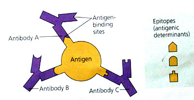 每个T细胞或B细胞上面有许多抗体 (antibody),就像上面那张图里面紫色的部分一样,每个细胞有很多个抗体,但是同一个细胞表面的抗体会全部都一样,也就是说抗体有很多种,但是一个B细胞或T细胞上面,只有一种抗体分布在上面。而一个抗原(antigen)则会有许多小部分 (epitopes) 可以让某一个特定的抗体所辨认,所以一个抗原,有时候会需要三个抗体才能完全被辨认和结合。