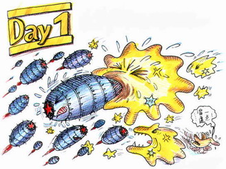 第九天,同时,兵工厂的B细胞制造出可攻击病菌的抗体;抗体像巡弋飞弹一样,可以精准地击中病菌 (不会打到鸭子)。