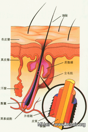 管,它决定毛发生长时截面的形状。内毛鞘下部为三层:HUXLEY鞘、HENLE鞘和内毛根鞘表层。在毛发角蛋白化以前,内毛根鞘与毛发一起生长,其来源