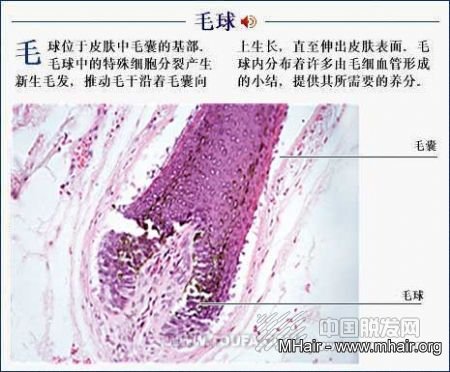 毛球位于毛发的根部,是最宽大的部分,有许多未分化的细胞,是一种增殖能力和分化潜能很强的细胞群。