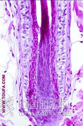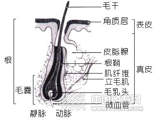 个部分。头发露在皮肤外面的部分称为毛杆,埋在皮肤里面的部分称为毛根,毛根下端略微膨大的称为毛囊,毛囊下端内凹入部分称为毛乳头。在毛乳头中有来自真