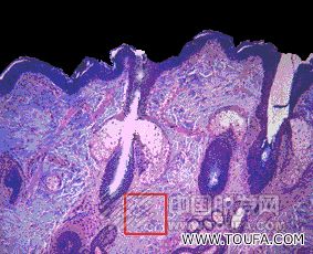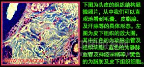 皮的组织结构示意图及显微照片各两幅,从中可以直观透彻地看到毛囊及头皮的细胞组织结构。