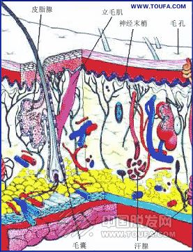 皮组织的神经末梢、血管和结缔组织,为头发的生长提供营养。每个毛囊都和一块立毛肌相连,当精神紧张或受到寒冷刺激时,会引起立毛肌收缩。下面是头发及头
