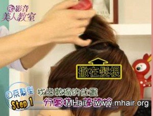 从大约后脑勺中间的部份,由下往上,一层一层的,均匀将蓬蓬粉撒在发根的部份,