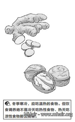 食物冷熱之道的另一方面即是指食物性質的冷與熱。如冬季寒冷,應吃溫熱的食物;夏季雖炎熱,但有陰氣伏在體內,所以夏天吃熱一點的,讓身體微微出點汗也是件好事。古人講,夏天不出汗,秋天容易得風瘧之病。