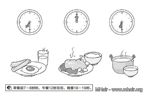 簡言之,吃飯要定時定量。中國人習慣的進食時間是:早餐7~8時,午餐12時左右,晚餐18~19時。按時進餐 不但可以保證人體營養物質的需求,而且有利於消化系統的消化和吸收,對健康有益。定量是指每日進餐量基本固定,饑飽適宜,避免過饑過飽、暴飲暴食的不良飲 食習慣。