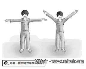 經常用電腦的人,平時可以多做刁氏脊椎保健操的第一、二、三節(詳見本書第7章)。在這裡,我教給大家一個非常 簡單的頸椎保健操,特別適合那些長期使用電腦的上班族。我教過的朋友幾乎百分之百見效。方法非常簡單,就是將兩臂向兩側伸直成「九點一刻」狀,保持手掌與 手臂成橫平狀,手掌朝前方,然後兩臂從「九點一刻」到「十點十分」起伏,連續做200次,每天早晚各做一次。基本一星期見效,一個月收效顯著。