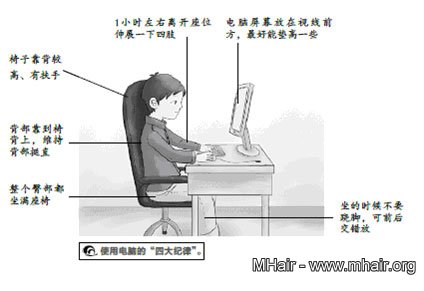 紀律一:我們在使用電腦時,可選擇靠背高度合適(從臀部至枕骨)有扶手的椅子,最好使整個臀部都坐滿座椅,使背部靠到椅背上,維持背部挺直。