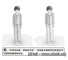 有句話說得好:「經常聳聳肩,頸椎保平安。」天天用電腦的人最好堅持天天做正確規範的聳肩動作。做的時候,頭要 保持正直,挺胸拔頸,兩臂垂直於體側,然後兩肩同時盡量向上聳起(注意,是聳肩而不是縮頸),讓頸肩有酸脹感。兩肩聳起後,停1秒左右,再將兩肩用力下 沉。一聳一沉為1次,16次為1組。每天上班的時候堅持做3~5組。每天累計總數應力求達到100~120次。這個小動作不受場所、時間的限制,無論是在 辦公室,還是在家裡都能做。
