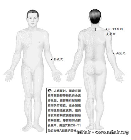 如果已發生病變可採用手法正脊復位。如果只是普通感冒,為了防止誘發頸椎病,一定要先治好感冒,可點揉孔最穴和曲池穴,並配C6-T1處的夾脊穴。