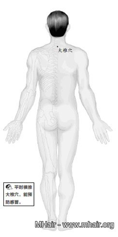 要預防感冒,最好的秘方就是平時多推大椎穴。因為感冒首先入肺,而支配肺的神經叢是從大椎穴分出的。多推這裡可預防感冒引起的咳嗽等症。
