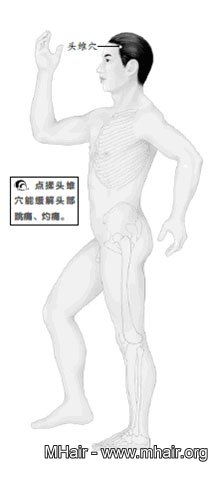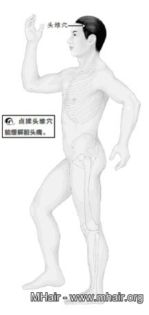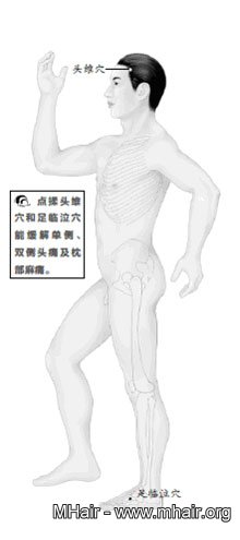 像這種情況,平時如何保健呢?可練習刁氏脊椎保健操的第一、二、三節(詳見本書第7章)。平時多點揉頭維穴,並配足臨泣穴。