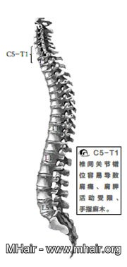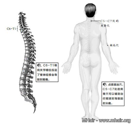 五十肩、網球肘、腕腱鞘囊腫及手指麻木是因為C5-T1椎間關節錯位所致,最常出現的症狀是肩痛、肩胛活動受 限、手指麻木。具體表現為單肩或雙肩活動受限、臥床時劇痛,上臂放射痛,如刀割樣或撕裂樣痛;時有肘痛,腕部腱鞘腫脹;時有全手麻,拇指、食指麻,中指、 無名指、小指麻,也有僅無名指、小指麻者。對於這些問題,我們只要找到錯位的頸椎,並進行正脊復位就可解決了。