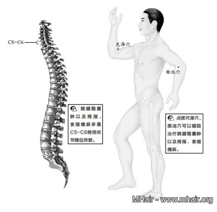 腕腱鞘囊腫以及拇指、食指痛麻多是C5-C6椎間關節錯位所致。我們認為,C5-C6發出的神經相當於中醫裡的手太陰肺經、手陽明大腸經。肺經是通到拇指的,而大腸經是通到食指的。因此,出現了拇指、食指痛麻,我們可以點手太陰肺經和手陽明大腸經上的穴位。