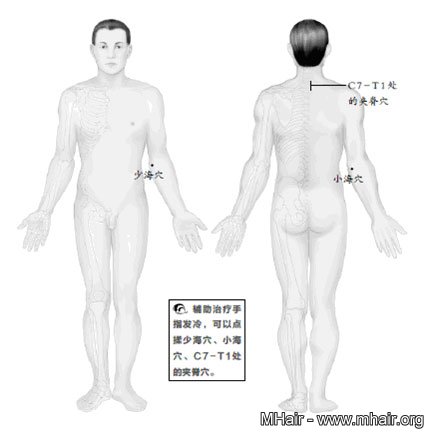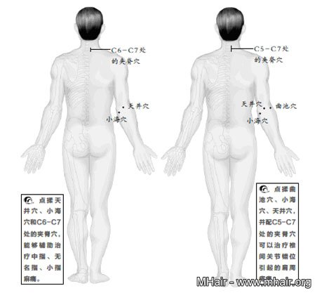 我們可點揉天井穴和小海穴,並配C6-C7處的夾脊穴。天井穴是手少陽三焦經的穴位,在臂外側,屈肘時,肘尖直上1寸凹陷處。小海穴是手太陽小腸經上的穴位,在肘內側,尺骨鷹嘴與肱骨內上髁之間的凹陷處,屈肘可取穴。