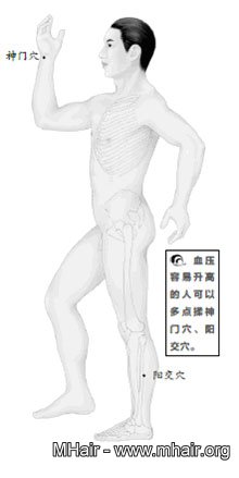血壓容易升高的人平時可多練習刁氏脊椎保健操的第一、二、三、四節(詳見本書第7章)。穴位方面,可點揉神門穴,配陽交穴。