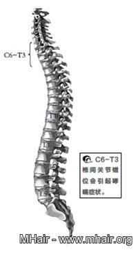 怎麼發生的呢?C7-T3一旦受到損傷,發生錯位後,壓迫了支配肺及支氣管的神經,就會引起肺及支氣管方面的 病。這種由胸椎導致的支氣管病發病前期,會有頸部、肩部酸累疼痛的現象,自己會感覺肩部好像背了一件很沉的東西似的;同時還會有頭暈、頭痛、失眠多夢、多 汗、心慌、煩躁、愛發火、氣促、胸悶等症狀。發病時,以咳嗽、咳痰、氣喘及反覆呼吸道感染為主。當然,這種由胸椎病變引發的支氣管病症,會因為胸椎的正脊 復位而好轉。