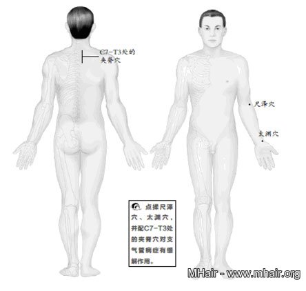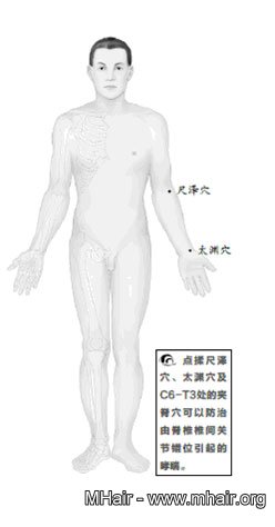 平時堅持練習脊椎保健操的第五、六節(詳見本書第7章);多點揉尺澤穴、太淵穴,並配C7-T3處的夾脊穴。太 淵穴是手太陰肺經上的穴位,它在腕掌橫紋橈側,橈動脈搏動處。太淵穴可補肺氣,它是肺經中元氣聚集最多的地方。此處就相當於肺經的源頭,肺氣便是由這裡源 源不斷地運往全身各處。中醫有「肺朝百脈,脈會太淵」的說法,因此刺激太淵穴就如同深挖井一樣,使肺氣源源不斷地運往全身,補肺氣的效果最好。