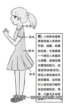 人類的生理曲度有什麼作用呢?除了使人體保持平衡外,還有減震、防震的功能。它就像是一個嵌在人體裡的大彈簧, 能增加緩衝震盪的能力,加強姿勢的穩定性。再加上椎間盤也可吸收震盪,這樣我們人類在進行劇烈的運動或跳躍時,顱骨、大腦才不會受損傷。大家可以體會一 下,如果你將一個直桿從上向下擲下來,戳在堅硬的地面上就很容易折斷;但如果是一個有曲度的桿子,擲下來就不會輕易折斷,因為桿子的曲度大大減緩了衝擊的 力量。
